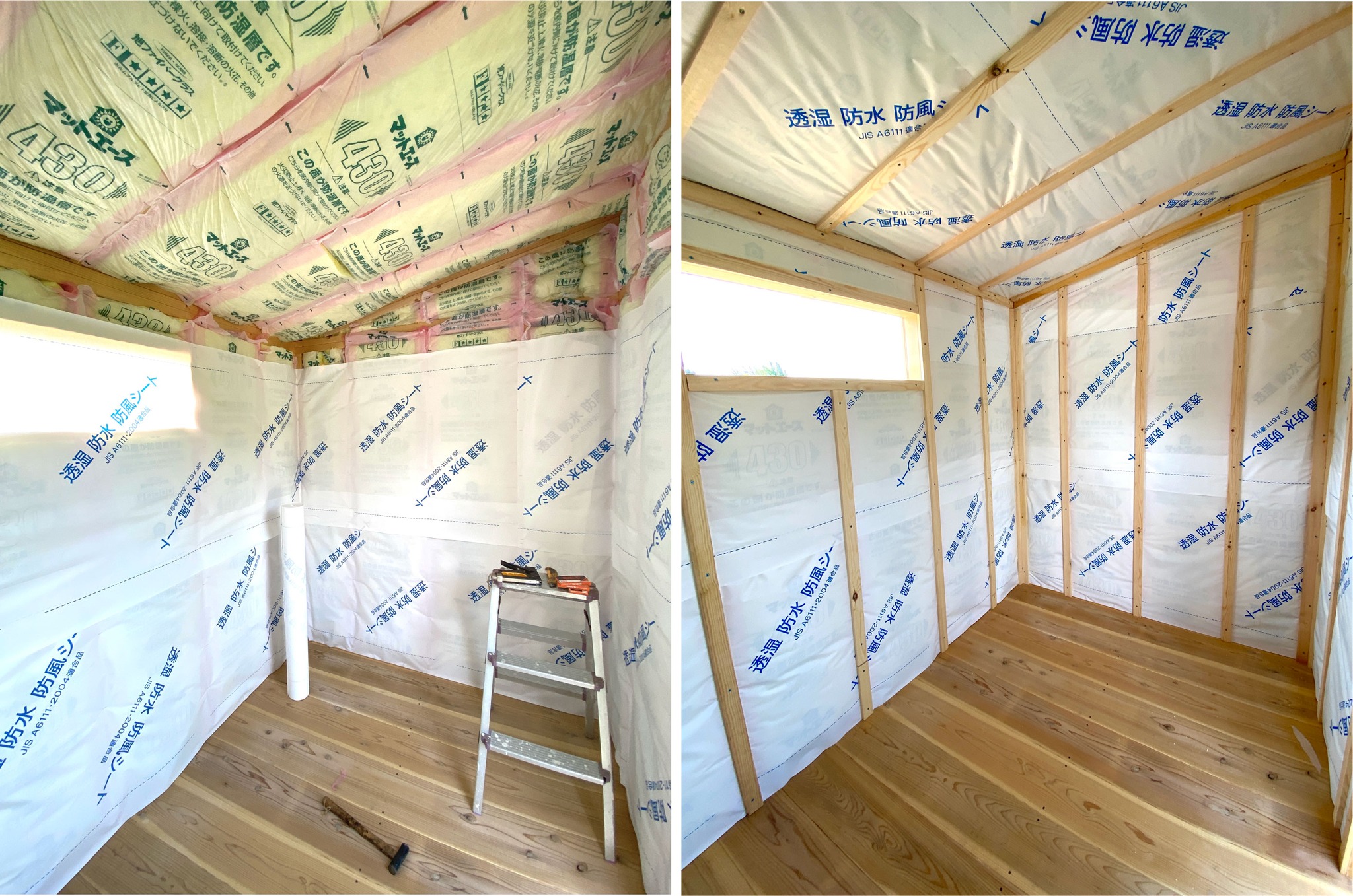 断熱材の施工が終わったので、次は室内側の透湿防水シート貼りを行いました。この工程は、断熱材を湿気から守りながらサウナ内部の環境を整えるための大切な作業です。